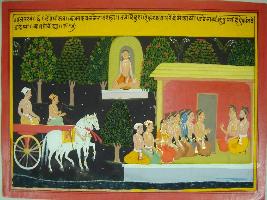 | Description / विवरण | Miniature painting based on Mahabharat - Vana parva depicting Pandavas are sitting in a hermitage of a sage in Kamyaka vana and Vidur come on chariot to meet them. |
