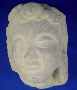 | Description / विवरण | Sculptured architectural fragment depicting a female head having knotted hair, half open eyes and thick lips. The face is slightly mutilated. |