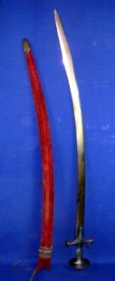 | Description / विवरण | Iron sword with curved blade and simple Alamgiri hilt. The scabbard is covered with red velvet and metallic kanthi and chaunthi. |