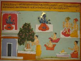 | Description / विवरण | Miniature painting based on Kashi khand depicting the fruitfulness of the worshipping of God. The painting depicts some people worshipping Vishnu at the upper left some people worshipping Shiv linga and the writing on top describing that worshipping of god in bigger than Dharma , Artha and Kama . At the upper right side Vishnu is depicted sitting in a palatial balcony. |