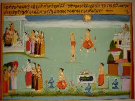 | Description / विवरण | Miniature painting based on Kashi khand depicting Budha reaching Kashi, establishing a linga and doing different types of penance like ekpagvarono, panchagni etc. Then he pleased Indra and saw him. At the lower right corner Budha talking with three apsaras. |