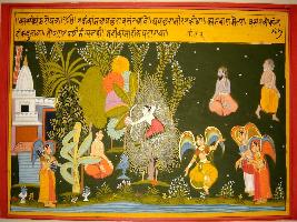 | Description / विवरण | Miniature painting based on Kashi khand depicting a sage meditating in a forest in spring season with lots of apsaras performing dance. Kamdev is seen on the tree, shooting arrow towards sage. A woman is playing Veena to his right. At the upper left, a sage is shown sitting and then leaving. |