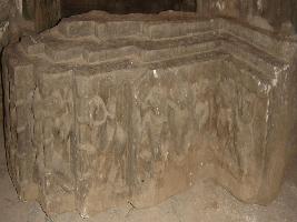 | Description / विवरण | Sculptured architectural fragment of a lintel depicting five female dancers in dancing postures in a races, a horse rider two animal faced figures on corner and on right side two figures are depicted which is totally mutilated. |