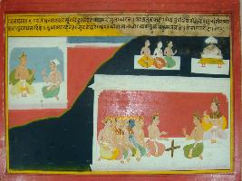 | Description / विवरण | Miniature painting based on Mahabharat - Vana parva. It is depicting Vidur asked Dhritrashtra that it becomes very bad to Hastinapur by defeating Pandavas in the chaupar game. On the right side of the painting the chaupar game is depicted. |