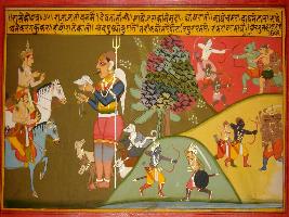 | Description / विवरण | Miniature painting based on Prithviraj Raso depicting Prithviraj meeting a Devta in the forest who has a Jata and wearing earrings, holding a chauri, a Shankh and a Manjeera. At the upper left part, painting depicts fight between Shiv and demon, below it fight between Ram and Ravan is depicted and at right of it fight between Arjun and Karna is depicted. |