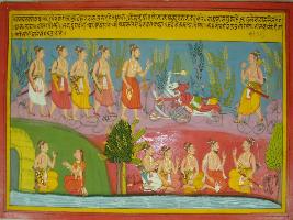 | Description / विवरण | Miniature painting based on Mahabharat - Vana parva depicting Pandavas sitting with Dhaumya rishi at the lower left part. Draupadi is shown with folded hands in front of Bhim and asking him to help others. At the upper right part, Pandavas with Dhaumya rishi are shown with a demon lying on ground. At the upper left, Bhim is shown coming to help them. |
