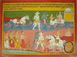 | Description / विवरण | Miniature painting based on Mahabharat - Vana parva depicting demons at upper level, going for war. At the upper part, Kuber is shown with his charioteer. At the lower part, Pandavas with Dhaumya rishi are standing with folded hands. Kuber is shown coming in his chariot to help Pandavas. In the lower middle part, demons are depicted. |