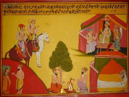 | Description / विवरण | Miniature painting based on Prithviraj Raso depicting Chandvardai talking to Prithviraj about the course of Sumant rishi and told him that he destroyed the family of Bhartar twice. |