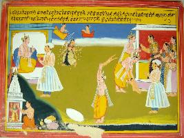 | Description / विवरण | Miniature painting based on Harivansha depicting a Brahman worshipping Yogamaya. The writings on top describing that Vasudev informing Kansa about the birth of a daughter at the upper right corner . Then Kansa took the body from Devki and killed her, who took the form of Yogamaya depicted on the left side . |