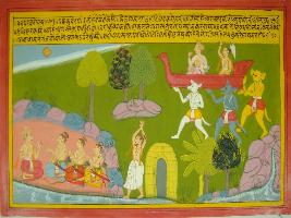 | Description / विवरण | Miniature painting based on Mahabharat - Vana parva. This painting depicted, Kuber is talking to Pandavas at lower right part. At the lower middle Agastsya Muni shown standing near bank of river and doing penance. Demons shown coming toward him at the middle left part of painting. They got curse from muni. Kuber is shown leaving in his Yati, at upper left part. |