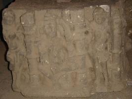 | Description / विवरण | Sculptured architectural fragment depicting a four handed God in lalitasana in a low relief on niche. While his attributes are not identifiable but he is attended by two female chauri bearers in standing position. Towards right of it there is a four handed god and he is also followed by a female attendant who is in standing position. |