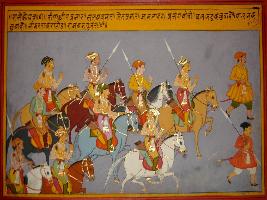 | Description / विवरण | Miniature painting based on Prithviraj Raso depicting Sardars of Prithviraj going for war. They are Randhir Parmar, Salash Parmar, Jet Parmar, Jam Parmar, Prasang Shichi, Balbhadra, Palan Kakhawaha, Nimar Rai Rathor, Ramban Gujar. |