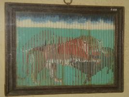 | Description / विवरण | A painting depicting tiger eating a boar and an elephant is seen behind. The paper is folded in a zigzag manner. The painting is framed in wood. |