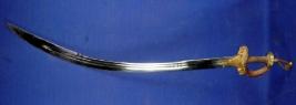 | Description / विवरण | Steel curved sword single edge with fake edge at upper part of the blade and two grooves. Hilt is embossed with floral designs golden colour. |