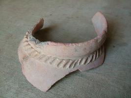 | Description / विवरण | It is a thick fabric, Red ware storage jar potsherd having a featureless Thumb rim. It is decorated with applique design of vertical standing lines on it. |