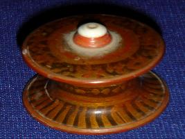 | Description / विवरण | Wooden chessman-black pawn, with flat, circular top and base and a cylindrical body. The top has a small ivory fitting in the centre. It has been decorated with designs in golden, black and scarlet lacquer colours. |