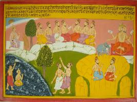 | Description / विवरण | Miniature painting based on Mahabharat - Vana parva depicting Dhaumya sage is holding the hand of Yudhisthir and says that at the west Mandrawal hill is situated where Varun lives. He also says that the king of sea protected all sea live. He again says that towards north Meru hill situated where Brahma, Saptarishi, and horse and elephants lives. |