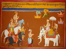 | Description / विवरण | Miniature painting based on Prithviraj Raso depicting Prithviraj meeting Indra riding on the elephant while going out for the morning walk. Apsaras and Devtas are seen with Indra. |