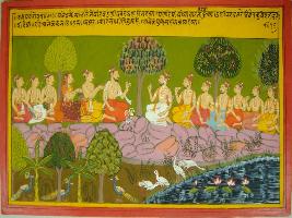| Description / विवरण | Miniature painting based on Mahabharat - Vana parva depicting Pandavas are talking to sages at Uni hill. At the lower part of lake, around which birds are chirping. |