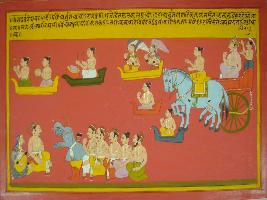 | Description / विवरण | Miniature painting based on Mahabharat - Vana parva depicting how Arjun passed his days at Amravati and come down to his brothers place and paying respect to Yudhisthir. |