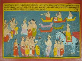 | Description / विवरण | Miniature painting based on Mahabharat - Vana parva depicting that Indra come down and meet Pandavas. Then he requested Arjun to go along with him to kill the demons. |