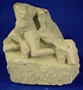 | Description / विवरण | Architectural fragment depicting a male flying celestial whose head, both arms and knee of right leg are broken. He is wearing a waist band and beaded necklace and fingers of left hand are seen on his chest. To his right side and left sides legs of another celestial figures are seen. |