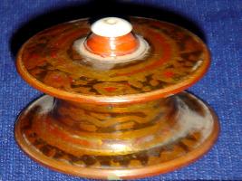 | Description / विवरण | Wooden chessman-black pawn, with a flat, circular top and base and a cylindrical body. The top has a small ivory fitting in the centre. It has been decorated with golden, black and scarlet designs with lacquer colours. |