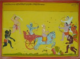 | Description / विवरण | Miniature painting based on Mahabharat - Vana parva depicting fighting that took place between demons and Arjun. |