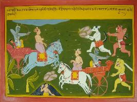 | Description / विवरण | Miniature painting based on Mahabharat - Vana parva. Yudhisthir and Arjun depicted fighting with demons who have taken up stone. |