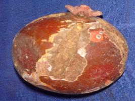 | Description / विवरण | A pomegranate, made of wood. The colours are flaking off all around it. |