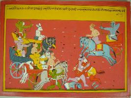 | Description / विवरण | Miniature painting based on Mahabharat - Vana parva. Arjun is depicted fighting with an army of demons all on chariot. |