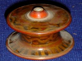 | Description / विवरण | Wooden chessman-black pawn, with flat, circular top and base and a cylindrical body. The top has a small ivory fitting, which is broken off. It has been decorated with designs in golden, black and scarlet lacquer colours. |
