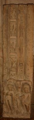 | Description / विवरण | Sculptured architectural fragment of a doorjamb depicting at the lower part goddess Yamuna with her vehicle tortoise. Her left hand is on the head of a human figure, while her right hand is chopped off from elbow. To her left a female attendant is holding an umbrella for her which is partially broken. The upper part four amorous couples and Kichak in a row are there. Rest part of the fragment has architectural designs. |