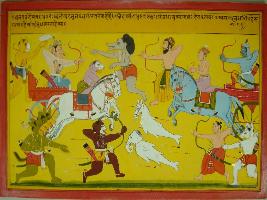| Description / विवरण | Miniature painting based on Mahabharat - Vana parva depicting Arjun telling to Yudhisthir that he saw the unique war between Deva and Danavs. There he saw mythical animals like combination of fish and elephant, fish and horse and others fighting in war. |