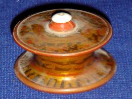 | Description / विवरण | Wooden chessman-black pawn, with circular top and base and a cylindrical body. The top has a small ivory fitting in the centre. It has been decorated with designs in golden, black and scarlet lacquer colours. |