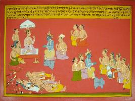 | Description / विवरण | Miniature painting based on Mahabharat - Vana parva depicting that Pandavas are resting while in the upper part Yudhisthir is asking Arjun regarding a Kavach . |