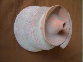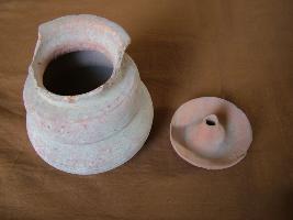 | Description / विवरण | It is a red ware well fired medium fabric partly broken. Miniature vase. It has a flaring mouth, neck straight and concave body, with concave base. Its lid is having a hole with raised and slanting body. |
