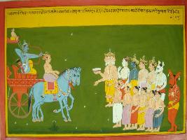 | Description / विवरण | Miniature painting based on Mahabharat - Vana parva depicting Brahma, Vishnu, Rudra, Indra and ten digpalas welcoming Arjun to heaven. |
