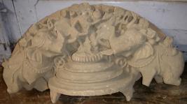 | Description / विवरण | Canopy of a deity depicting a male dancer head chopped off at centre and at his both sides celestial figures are seen. At extreme right and left elephant with riders are depicted but head of riders and fore limbs of elephants are chopped off. |