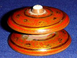 | Description / विवरण | Wooden chessman-rook white with flat and circular top and base and cylindrical body. The top has a small ivory fitting at the centre. It has been decorated with designs in scarlet, golden and black lacquer colour. |