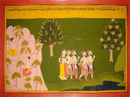 | Description / विवरण | Miniature painting based on Mahabharat - Vana parva depicting Pandavas with Draupadi travelling in forest at the left part of painting. At the right part a mountain is depicted on which two Gandharva are meditating. |