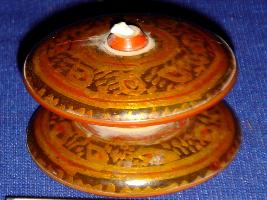 | Description / विवरण | Wooden chessman-black rook, with wide circular top and base. The top has a small ivory fitting in he centre. It has been decorated with golden, black and scarlet lacquer colours. |