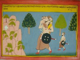 | Description / विवरण | Miniature painting based on Mahabharat - Vana parva depicting Bhim is carrying Yudhisthir, Draupadi, Nakul and Sahdev on his shoulder to Kailash mountain. |