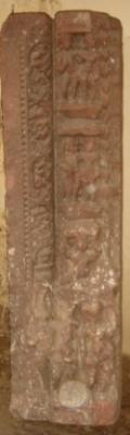 | Description / विवरण | Fragment of doorjamb depicting Kacchapa vahini Yamuna in lower part, flanked by two attendants. On the upper part, two couples are being carried on pedestal by Bharvahak Gandharva. On right side floral designs are carved. |