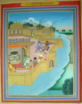 | Description / विवरण | Miniature painting depicting Hanuman burning Lanka. Ravan is sitting on a stool with other demons sitting in front of him and some are depicting running. |