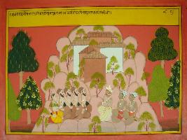 | Description / विवरण | Miniature painting based on Mahabharat - Vana parva. On the painting it shows that king Subahu come to meet Pandavas in vana. |
