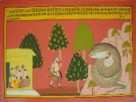 | Description / विवरण | Miniature painting based on Mahabharat - Vana parva depicting Yudhisthir is going out in search of Bhim who was caught by king Nahuk who become a python due to the curse of Agastsya sage. Draupadi and other two Pandavas are waiting for them. |