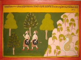 | Description / विवरण | Miniature painting based on Mahabharat - Vana parva depicting snake left Bhim after hearing talks of Yudhisthir. At the left part snake is shown over the mountain. At the right part, Yudhisthir is shown leaving with forest with Bhim. |