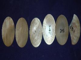 | Description / विवरण | Shell, round in shape like the size of one rupee with incised design on it. It is six total in number and one is broken. |