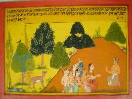 | Description / विवरण | Miniature painting based on Mahabharat - Vana parva depicting Pandavas and Draupadi is listening to Shiv rishi, while a crow and by accepting it a bad sign Yudhisthir ask Draupadi about Bhim who replies that he went for hunting but did not come back yet. |